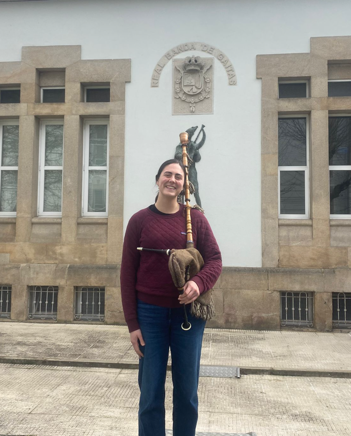 É o caso de Annika, unha estudante procedente de Minnesota que chegou a Ourense en setembro de 2025 e que, apenas un mes despois, en outubro, iniciábase no mundo da Gaita e da música tradicional galega da man de Xosé Lois Foxo e arroupada polos seus compañeiros. “Enamoreime de Galicia cando vin hai uns anos co meu grupo da universidade. Estivemos en Santiago e alí vin por primeira vez aos gaiteiros”, explica. Decidida a volver, buscou un programa de intercambio e chegou ao IES O Couto como auxiliar de conversa. “Eu quería facer algo coa música. Toquei sempre, desde moi pequena. Primeiro o violín, con 4 anos, e o piano con 6. Cando cheguei dixen que me encantaría aprender sobre música galega e empecei a preguntar. Unha profesora de instituto que ten unha filla estudando na escola trouxome e así foi como coñezo a esta xente tan marabillosa”.